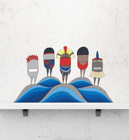 5 Amazon warriors in traditional dress standing among the waves! Spark a little cultural interest in your home. By Eggpicnic.